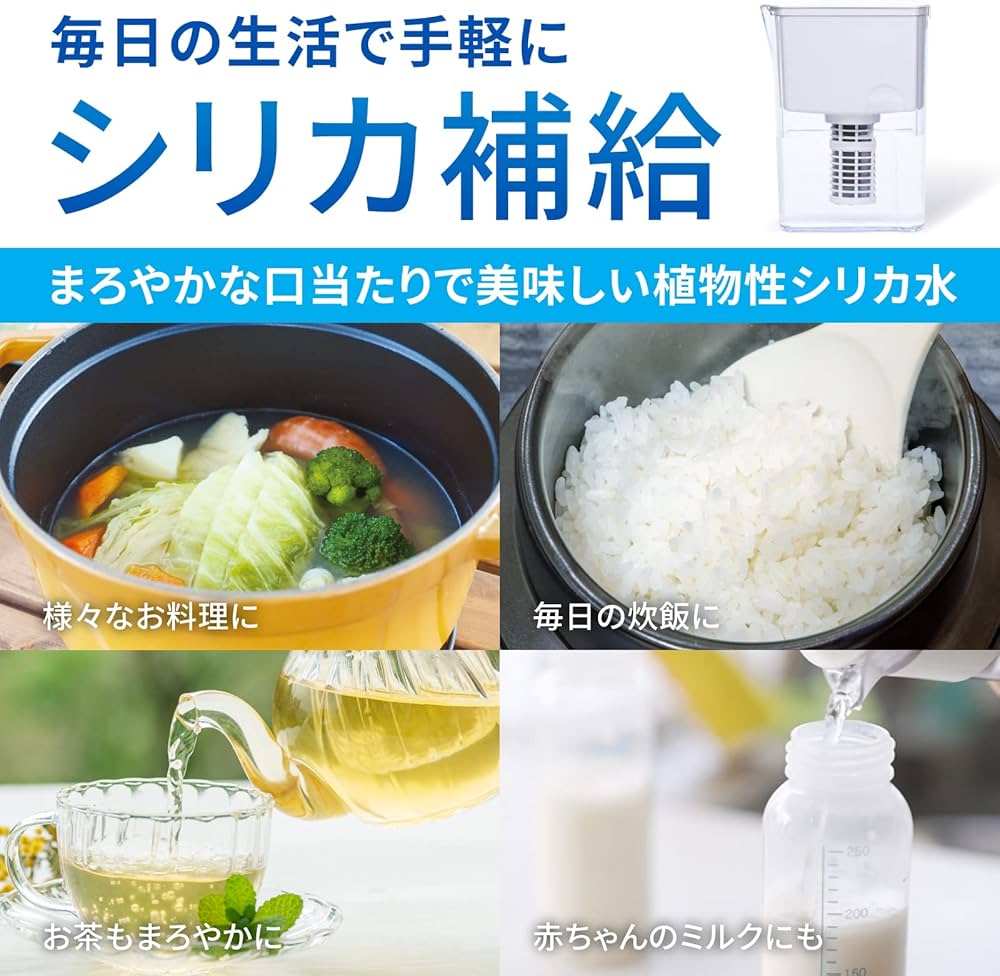 Welvinaの大きな特徴のひとつが、シリカを含む水を作れる点です。 シリカは美容や健康意識の高い方から注目されている成分で、 日常的に摂取したいと考えている方も少なくありません。 市販のシリカ水は継続するとコストがかかりがちですが、 Welvinaを使えば、毎日の水道水から手軽にシリカ水を作ることができます。 長期的に見ても経済的で、習慣として取り入れやすい点が魅力です。